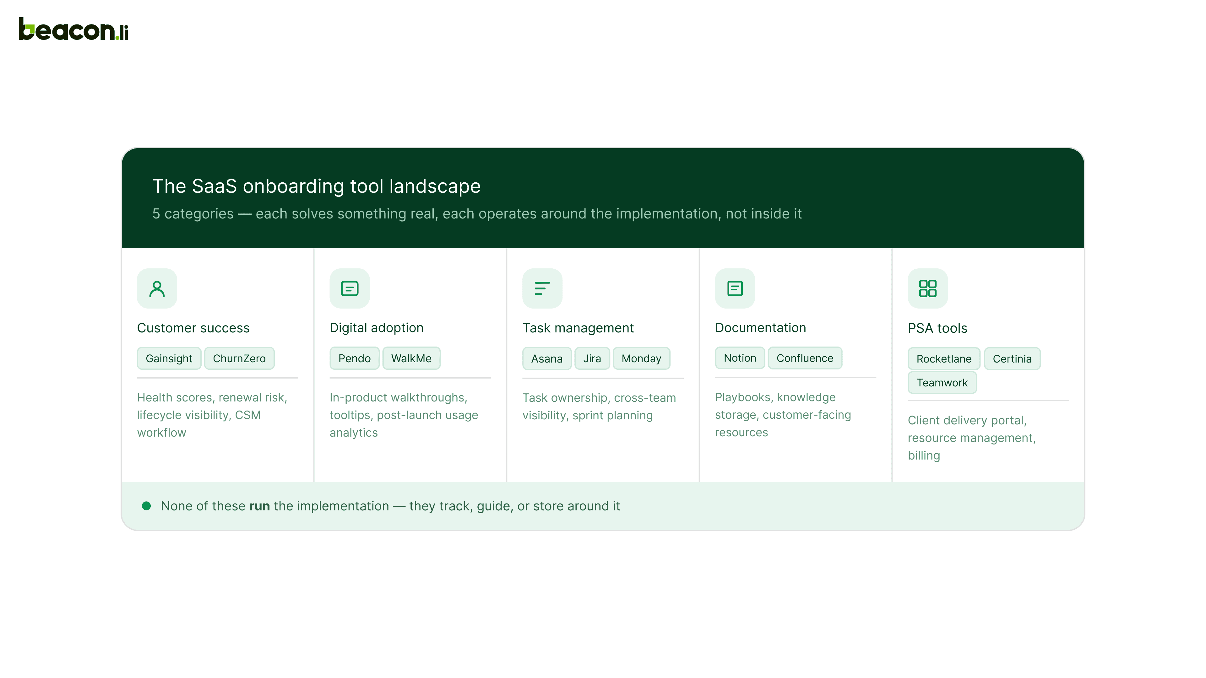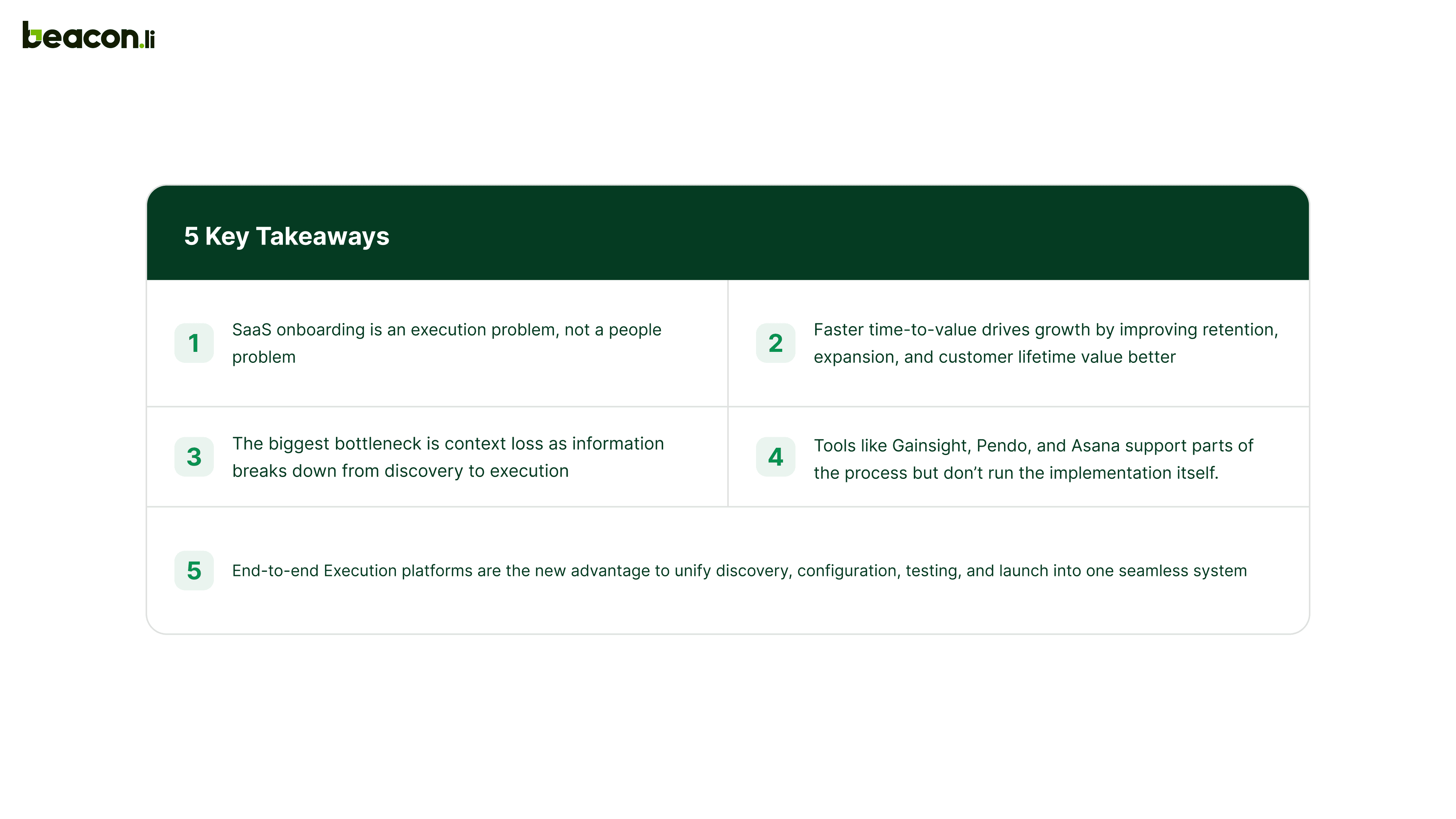 Ready to see what end-to-end onboarding execution looks like in practice? Explore how Beacon.li runs the full SaaS implementation lifecycle, from discovery to hypercare, natively, without the fragmentation.