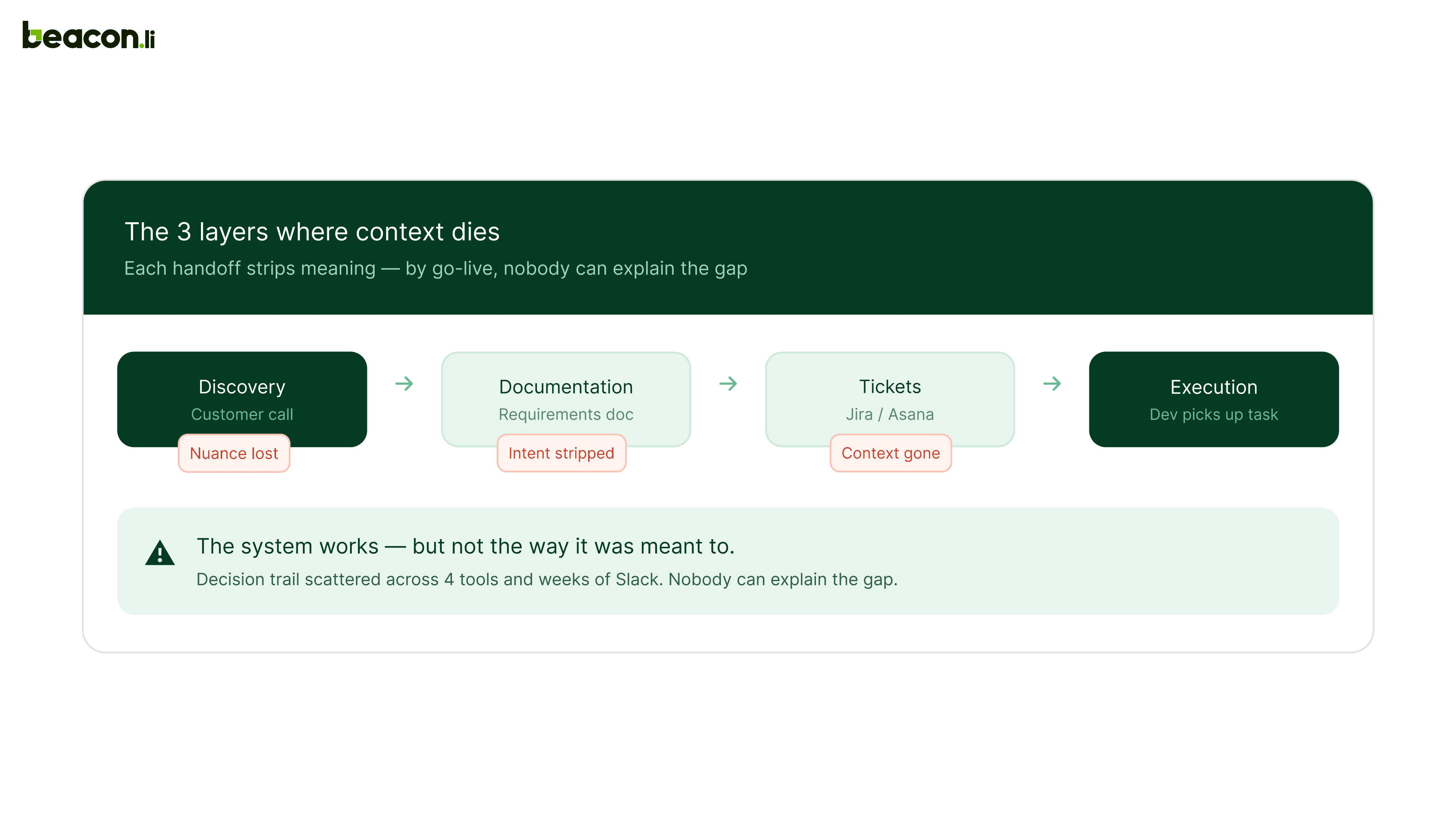 If your team uses Asana or Jira for task visibility, Beacon.li can sit above those tools and feed outputs to them. But the execution, the part that actually determines whether your implementation finishes on time, matches requirements, and leaves institutional knowledge behind, happens inside Beacon.li, not across a collection of tools hoping the context survives each handoff.