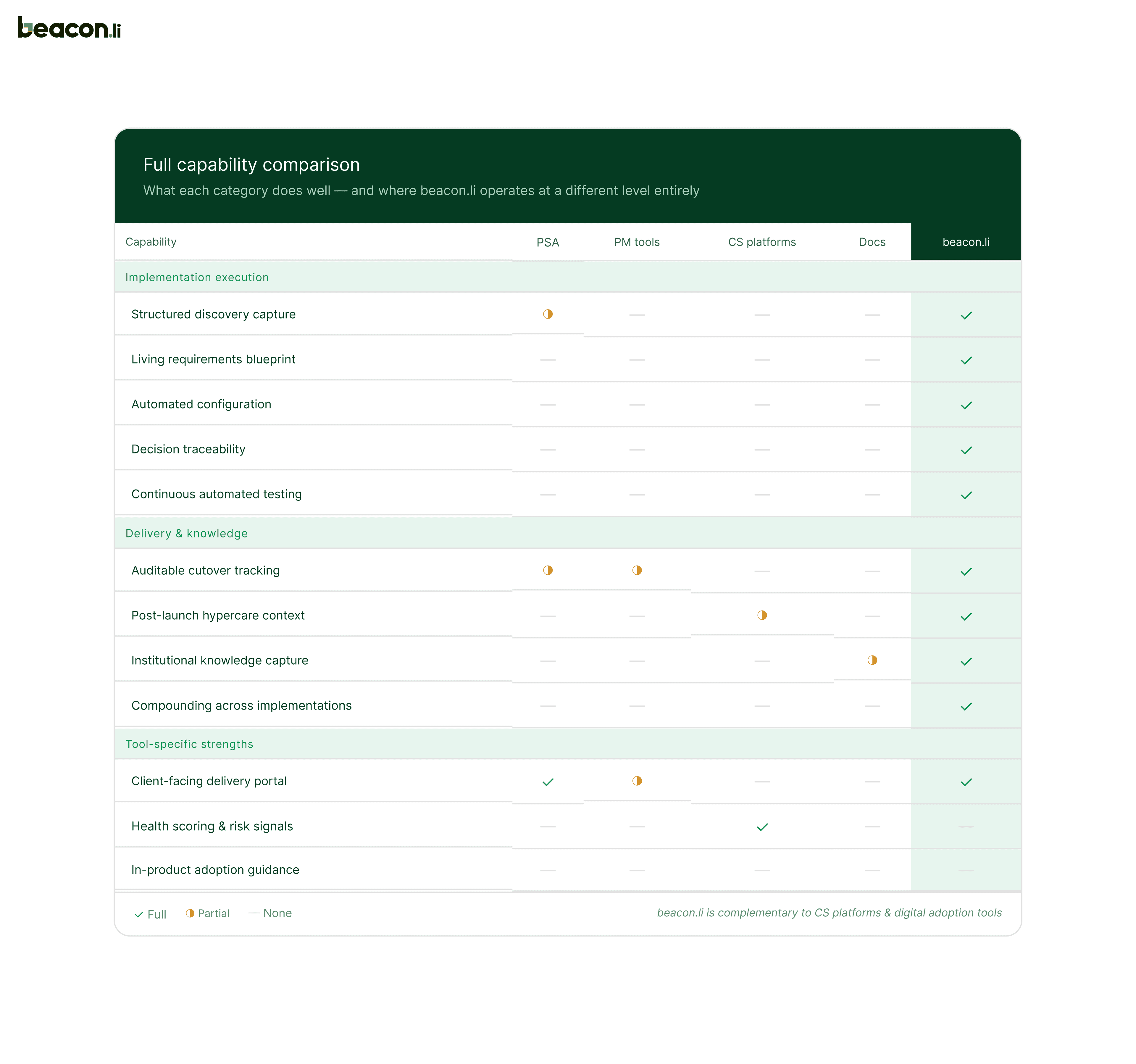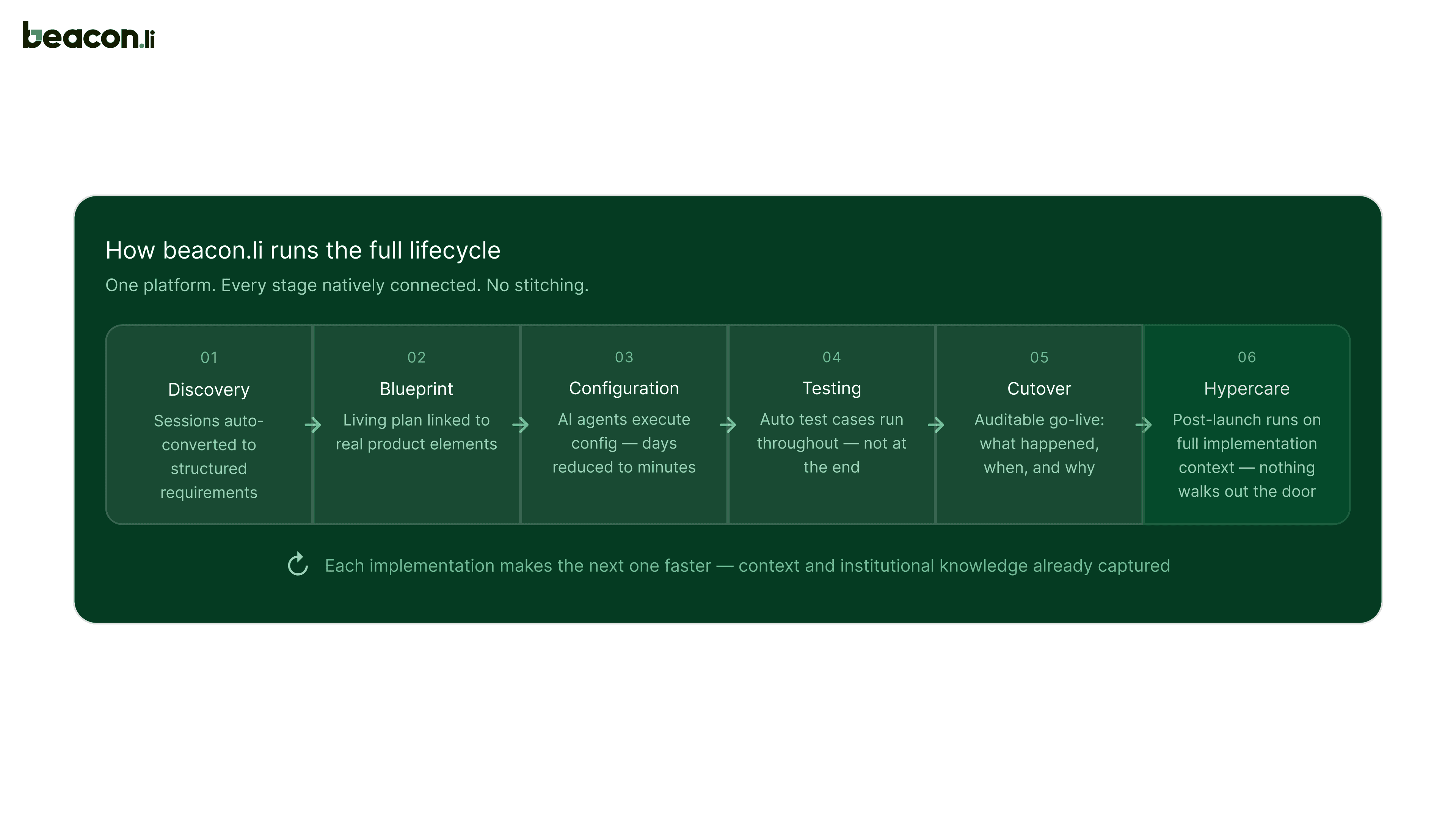 This is where Beacon.li represents a fundamentally different category. It isn't a tool that sits alongside your existing stack and connects the dots between them. It's an end-to-end AI execution platform that runs the full implementation lifecycle natively, from the first discovery session through to post-launch hypercare, without requiring a fragmented collection of tools to function.