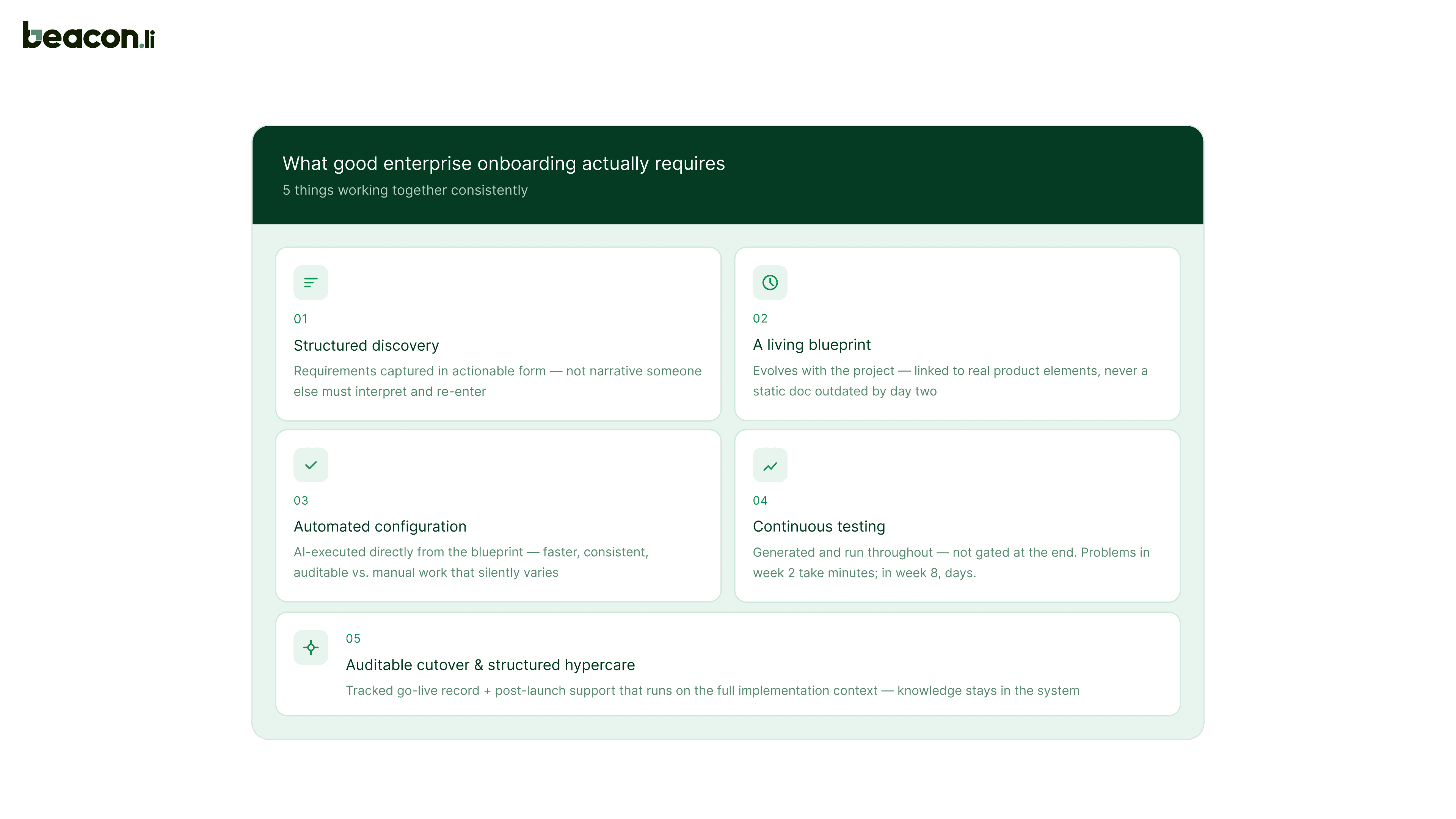 If discovery produces a document that nobody reads before writing tickets, and tickets are filled by engineers who haven't spoken to the customer, requirements will drift. The best enterprise onboarding processes keep a direct, traceable link from what the customer said they needed to what got configured, so when something is questioned, there's a clear trail. This traceability is built into how Beacon.li runs the execution: every configuration decision links back to the requirement that drove it.