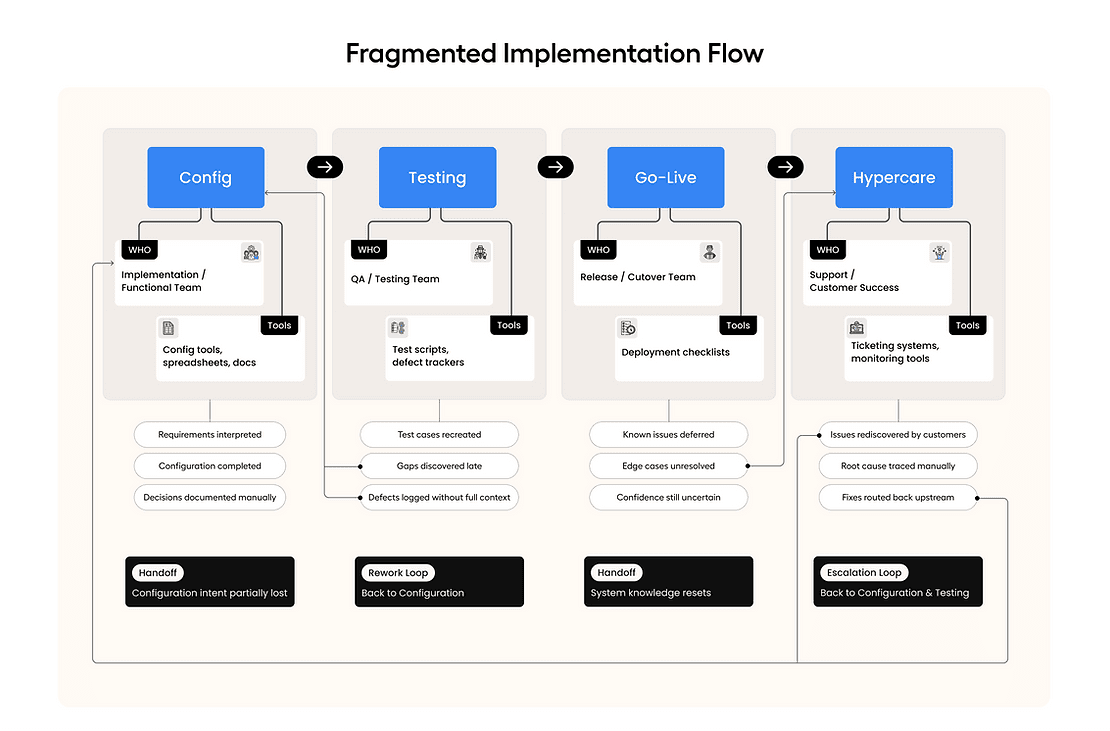 When configuration, validation, testing, and early support are stitched into a continuous flow, issues surface earlier, fixes propagate automatically, and customers experience momentum instead of handoffs.