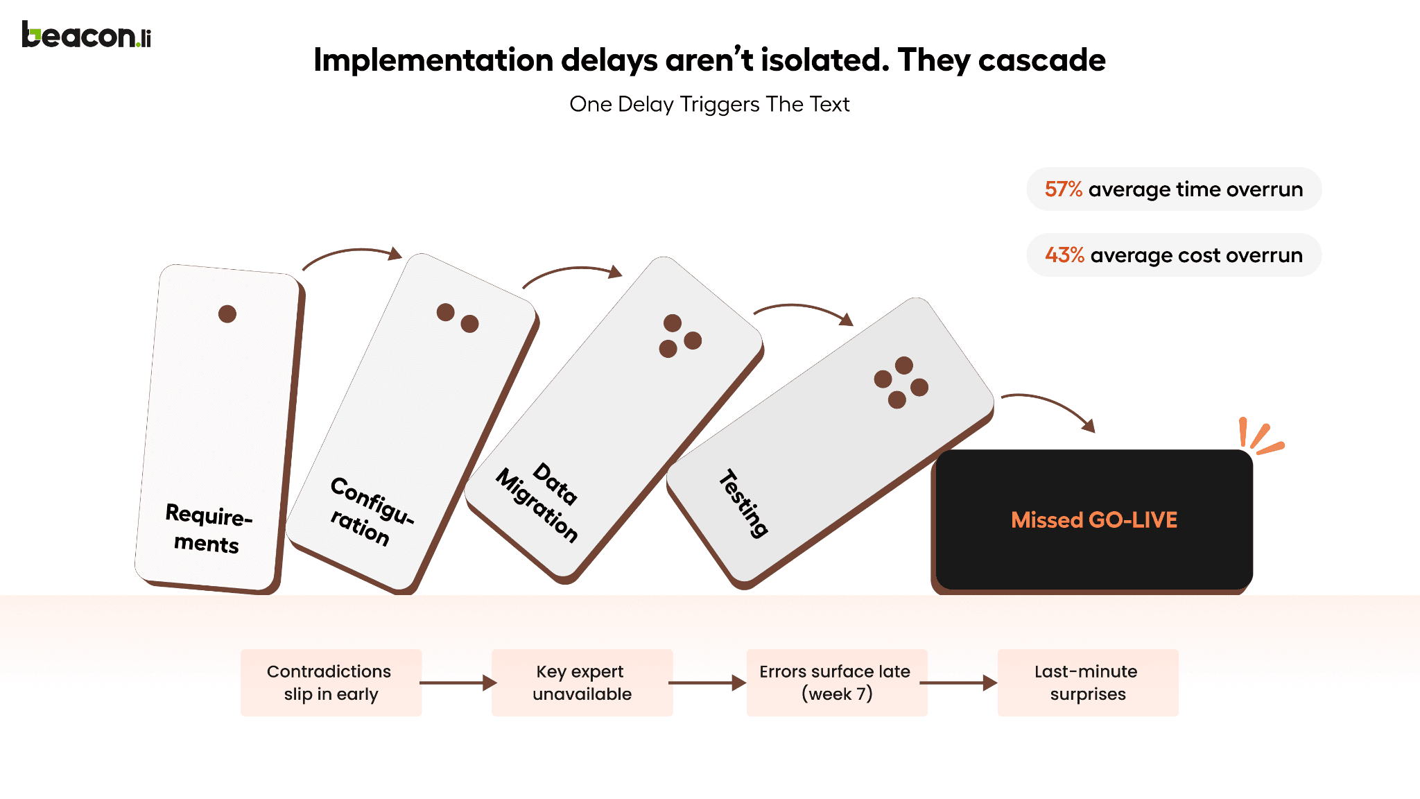 To fix SaaS implementation delays, enterprise teams need to stop treating implementation as a series of disconnected steps and start executing it as one continuous process. Most delays come from gaps between requirements, configuration, data migration, and testing, where work is passed manually between teams and tools. Tools like project management platforms, integration tools, and RPA can help streamline specific tasks, but they do not solve the full execution problem and often break in dynamic environments. The fastest teams move implementation onto an AI orchestration platform like Beacon.li, which runs the full lifecycle from requirements to go-live and removes these bottlenecks, reducing timelines by 60% or more.