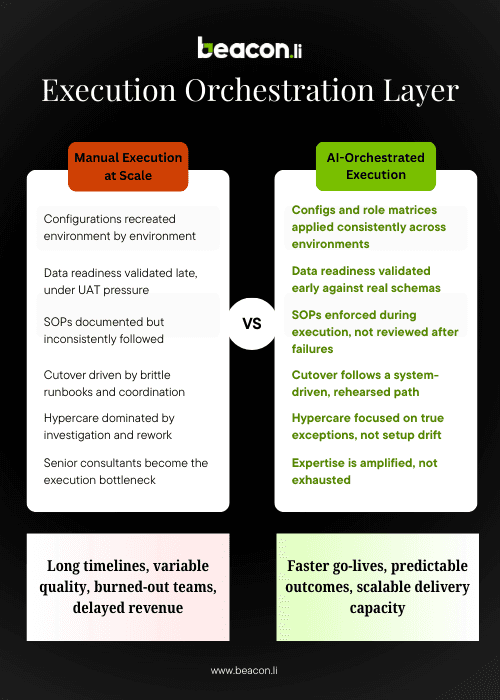 Instead of treating execution as a series of manual tasks, Beacon builds an executable model of how work actually happens inside the product: configs, workflows, permissions, data validation, cutover steps, and hypercare actions. Delivery plans don’t change. What changes is that execution is no longer translated into clicks by people.