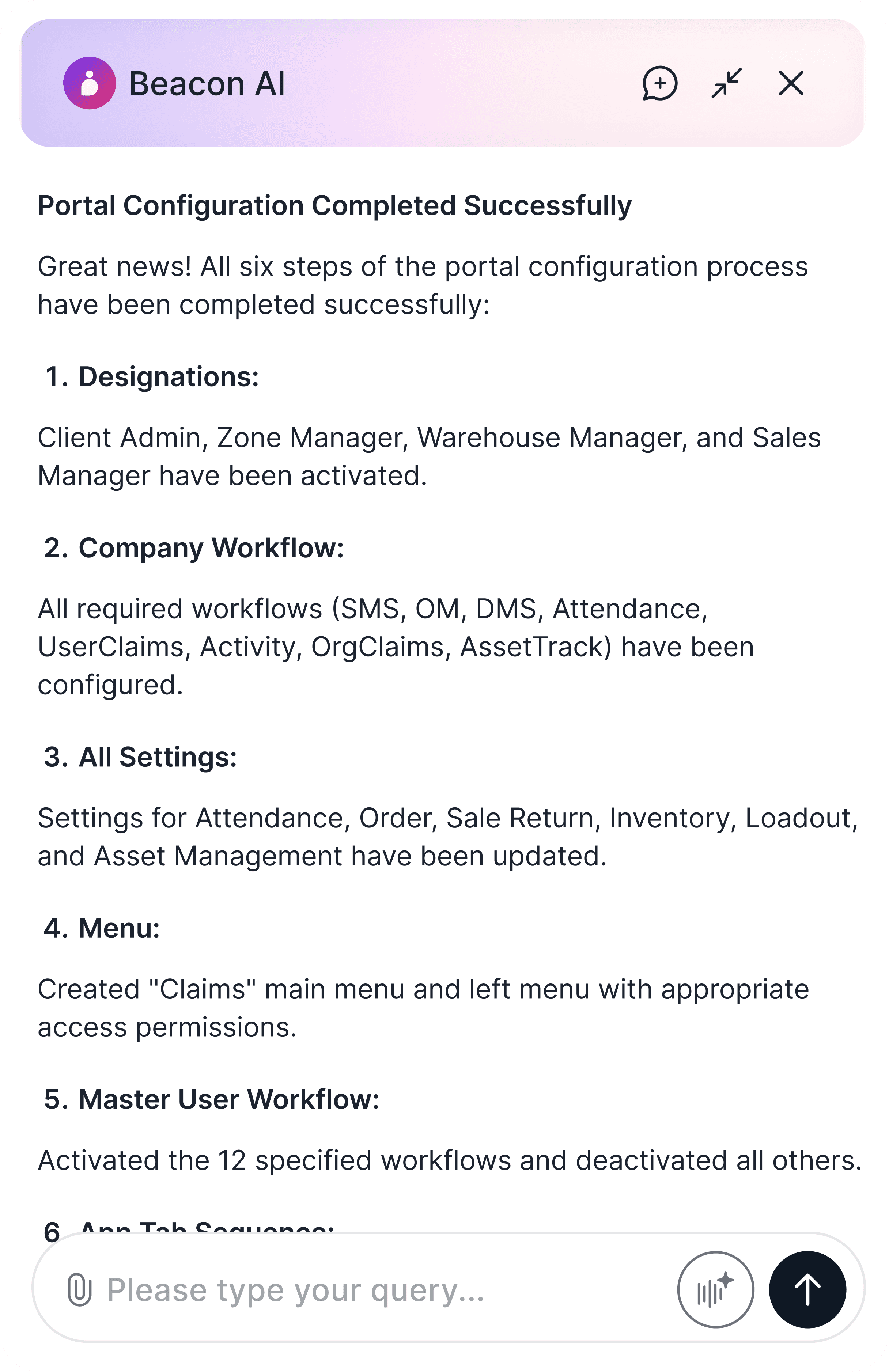 Each implementation stage could be triggered through simple, natural-language prompts like “Complete organization configuration”, “Deactivate regional manager role” allows consultants to communicate with the AI instead of navigating forms.