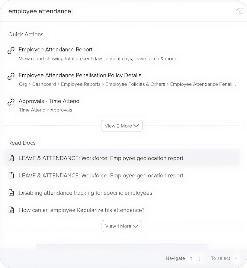 The Universal Search Bar simplifies navigation by allowing users to type or voice commands like “Run payroll” or “Approve leave.” This reduces clicks, speeds up actions, and increases engagement platform-wide.